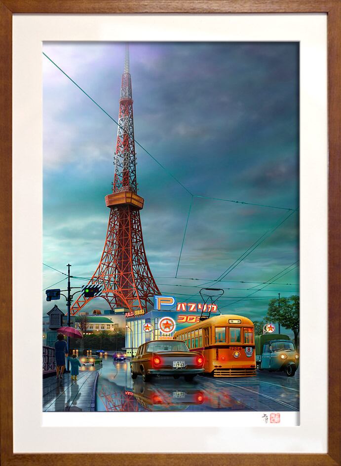 昭和38年頃の東京の夜景を描いた「東京宵時雨・1963」。この作品には、当時の東京が持つ魅力的な雰囲気と人々の生活が色彩豊かに表現されています。墨田川のほとりに浮かぶネオンの光、時雨が織り成す幻想的な風景が、上月伸仁の手によって巧みに再現されました。街の明かりが映り込む水面や、情感豊かな雲間から差し込む光が、見る人に深い感動を与えます。懐かしさと新しさが融合した一枚は、東京の歴史を感じさせる貴重なアートです。