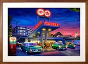 ●東京オリンピックを機に、高速道路や東海道新幹線が開通した頃の丸の内・八重洲あたりです。今では東京駅八重洲口もすっかり様変わりし、新デザインの玄関と高層ビルとが相まってあの頃を見るよすがもありません。プリンス.グロリア、トヨペット.クラウン、日産ブルーバード。そして、東宝の映画・若大将シリーズで銀座のスポーツ店の店員も乗っていたミゼット。個性豊かな昭和の車たちの共演。そんな昭和レトロを、上月伸仁が総天然色で描きました。