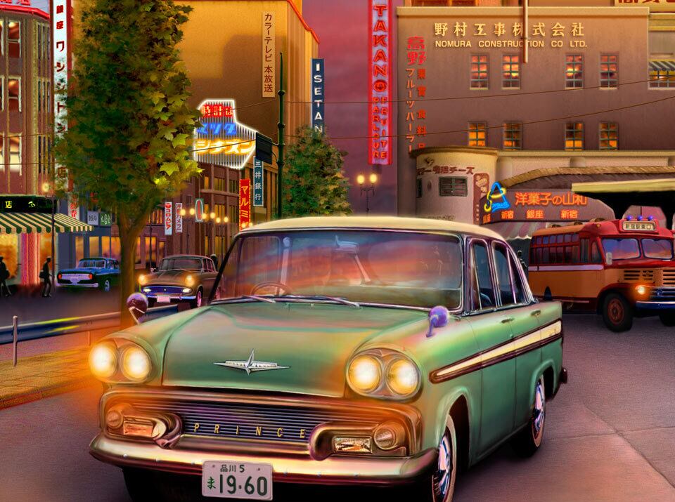 そんな昭和レトロにプリンス・スカイラインとボンネットバスを走らせ総天然色で上月伸仁が描きました。