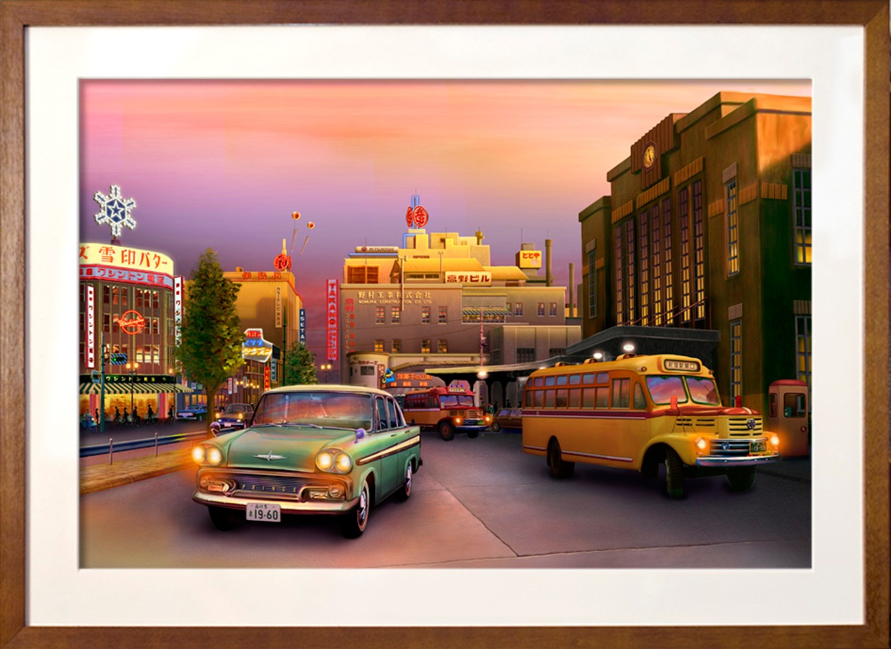 昭和35年頃の新宿の街並みを舞台にしたこの作品「茜色の街 新宿・1960」は、上月伸仁が描く懐かしい昭和の風景を色彩豊かに表現しています。当時の新宿は、繁華街として賑わいを見せ、さまざまな人々が行き交う活気ある風景が広がっていました。茜色に染まる夕焼けの空とともに、煌びやかなネオンや独自の企業看板が印象的に描かれ、当時のエネルギーと魅力が巧みに再現されています。見る人に深い感動を与えるこの作品は、単なるアートを超え、心に残る特別な体験を提供します。
