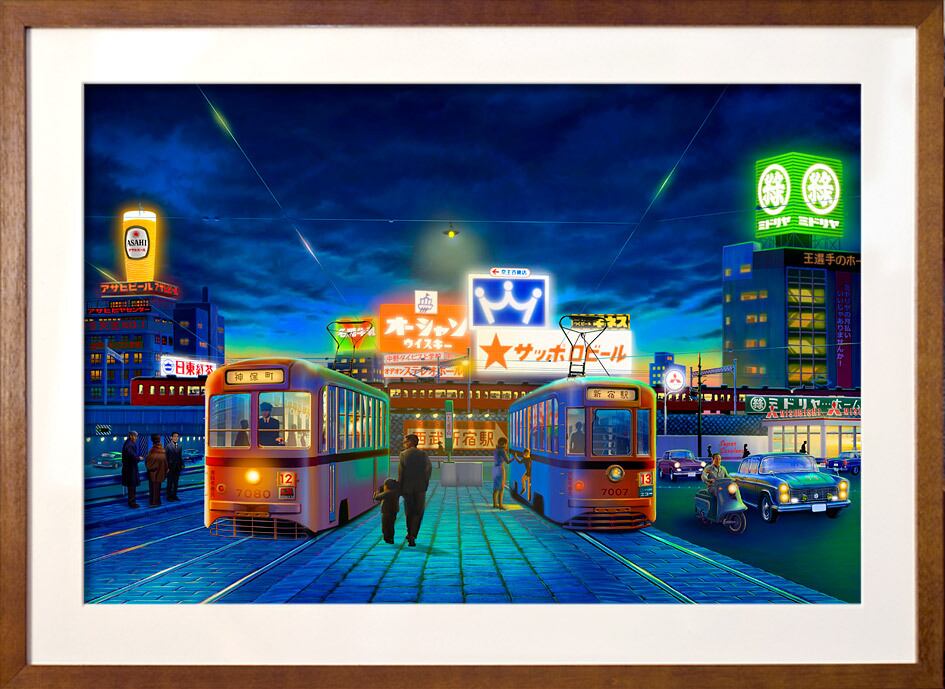 「新宿角筈暮色・1964」昭和39年頃、新宿停留所を舞台にした、懐かしの情景が広がる作品です。彩り豊かなジクレー版画によって、当時の新宿の賑わいが見事に表現されています。煌めくネオンと人々の行き交いが織りなす風景は、まるでその時代にタイムトリップしたかのような感覚を与えてくれます。上月伸仁の手によるこの作品は、昭和レトロの魅力を存分に味わえる一枚です。
