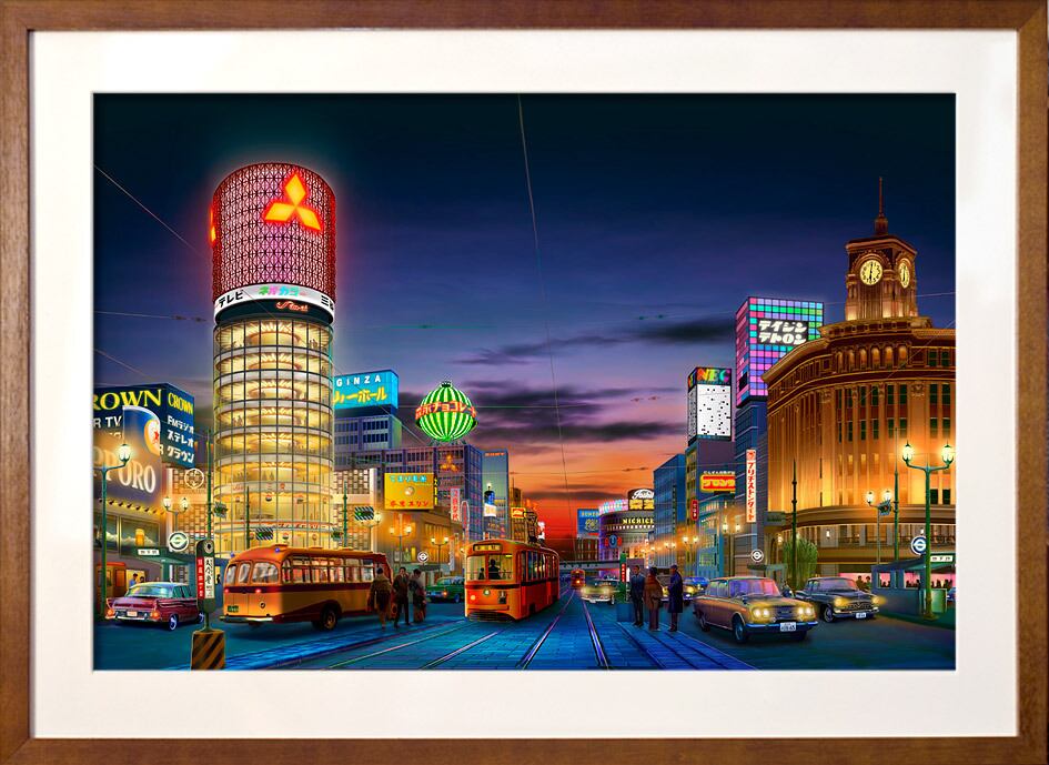 華やかな街角には人々が行き交い、夕日の柔らかな光がビル群を染め上げています。東京の象徴とも言える銀座の賑わいは、当時の文化と繁栄を示しています。東京オリンピック直後の高度成長と期待感に満ちた街の様子を、上月伸仁が鮮やかな色彩で描き出しました。