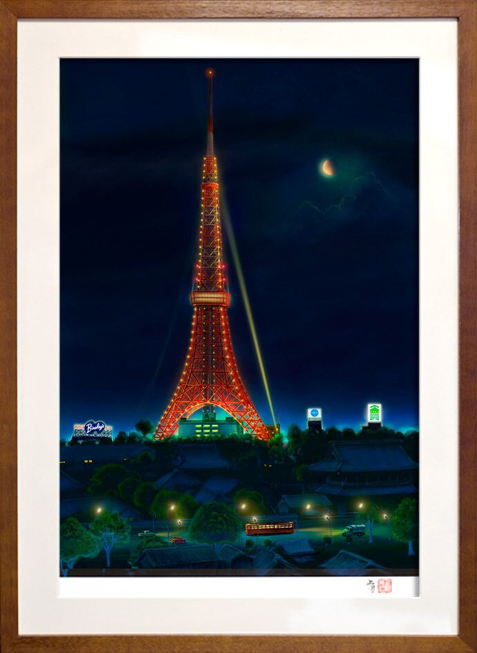 「憧憬の灯」東京タワーが建った頃、その周囲には高い建物など殆どなく、戦災の跡が残ってた増上寺境内には月光仮面が走り、日比谷通りには都電や、当時のコロナ、ブルーバードも走ります。遠景のビルには昭和らしい、バヤリースオレンジ、パンナム、田辺のアスパラのネオン。