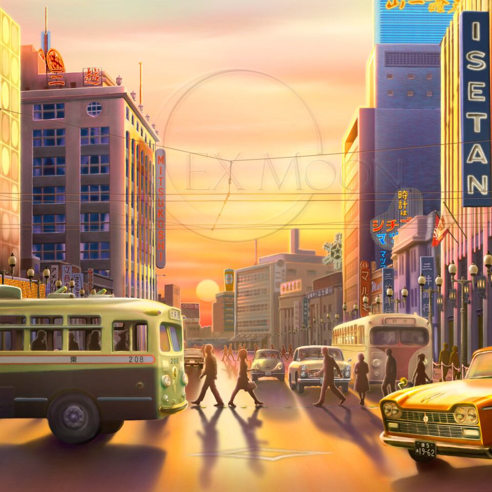 東京・新宿の懐かしい夕暮れを描いたこの作品は、上月伸仁が表現する美しい瞬間です。1962年の新宿三丁目の街の情景が、温かい光に包まれた瞬間を切り取り、観る人々を幻想的な世界へと誘います。夕日の柔らかな光が江戸時代の風情と現代の都市の融合を感じさせ、まるでその場にいるかのような感覚をもたらします。